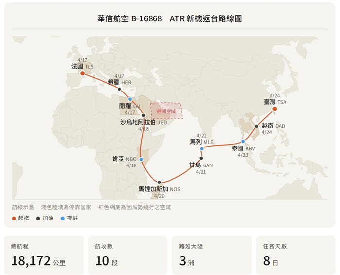 親自赴法國接機的華信航空總經理莊明哲指出,此次在ATR原廠迎接第13架新機加入華信機隊,深具歷史性意義,這不僅是機隊的新成員報到,更象徵華信航空ATR2.0機隊正式成軍。莊總經理進一步說明,新機自法國返台航程,因受中東局勢影響,採取繞道飛行,航程由原定5天延長至8天,沿途飛越法國、希臘、埃及、沙烏地阿拉伯、肯亞、馬達加斯加、馬爾地夫、泰國及越南,橫跨歐、非、亞三大洲,充分展現機組人員專業調度能力與ATR機型優異的飛航穩定性。