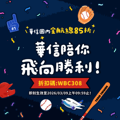 即刻起至2026/03/09 09:59,只要在華信航空APP購票並輸入折扣碼「 WBC308 」
